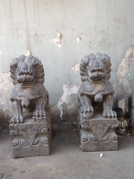Die beiden Löwen auf dem Banner habe ich, neben anderen Skulpturen, in einer Seitengasse in der Altstadt von Shanghai entdeckt. Offensichtlich handelt es sich um Stücke eines Händlers. Nach drei Jahren habe ich sie dort vor kurzem wiedergesehen. In Shanghai, einer Stadt, die sich in einem atemberaubenden Tempo ändert – Viertel werden abgerissen, neue Gebäude in Windeseile errichtet; Geschäfte, in denen man letzte Woche noch eingekauft hat, verschwinden spurlos und andere, meist grell bunte mit lauter Beschallung, haben ruck, zuck eröffnet – sehe ich das mit Beruhigung.
