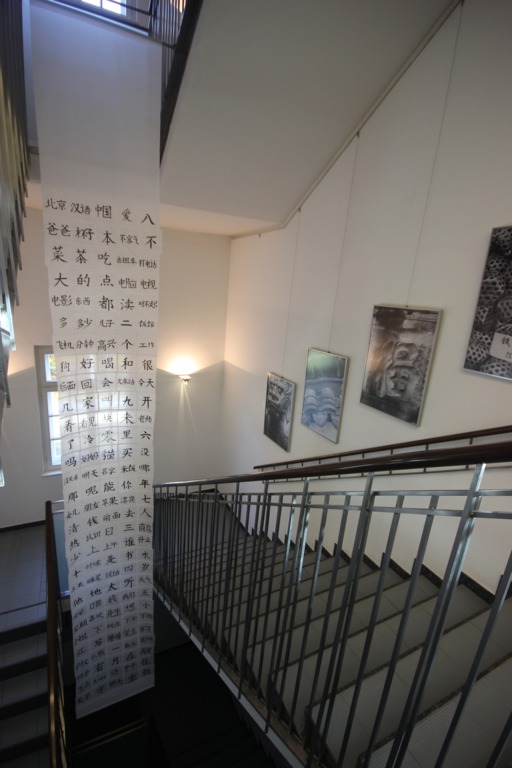 Auf dem großen Banner im Treppenauge sind die 150 Wörter des HSK 1 Tests zu sehen. HSK werden die Sprachprüfungen in China genannt. HSK 1 ist der niedrigste Level, HSK 3 muss man bestanden haben, um z. B. an einer chinesischen Universität als Ausländer studieren zu können.